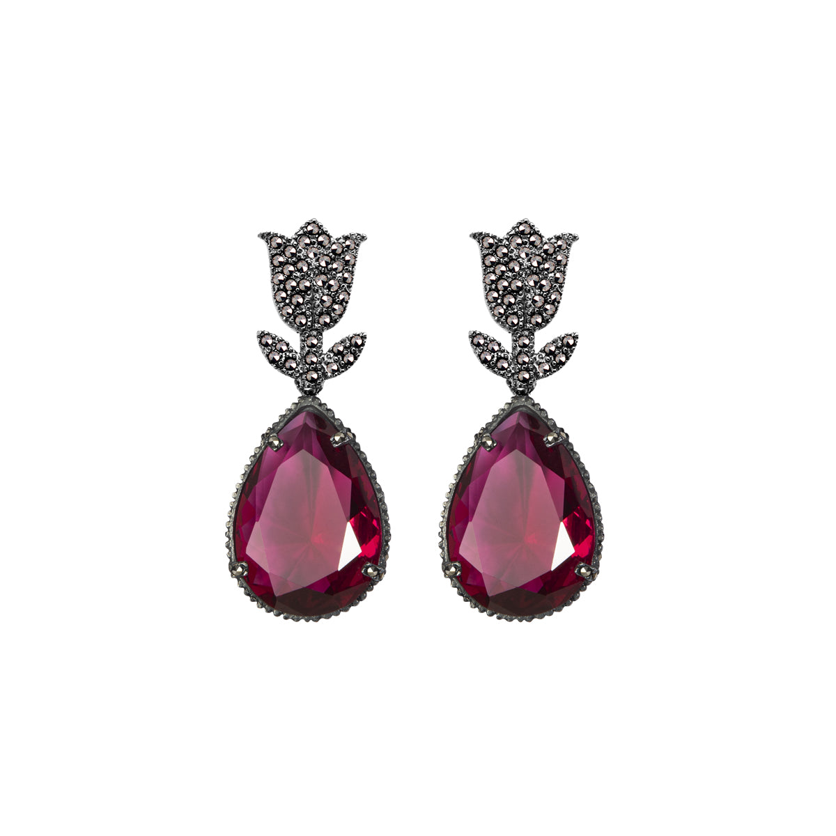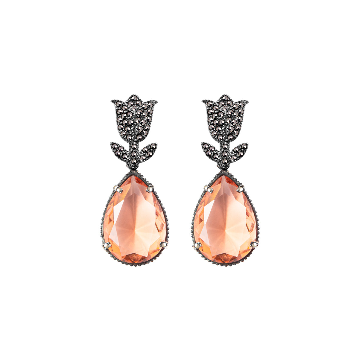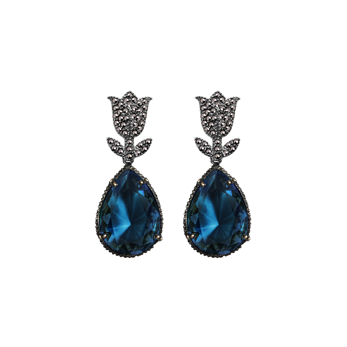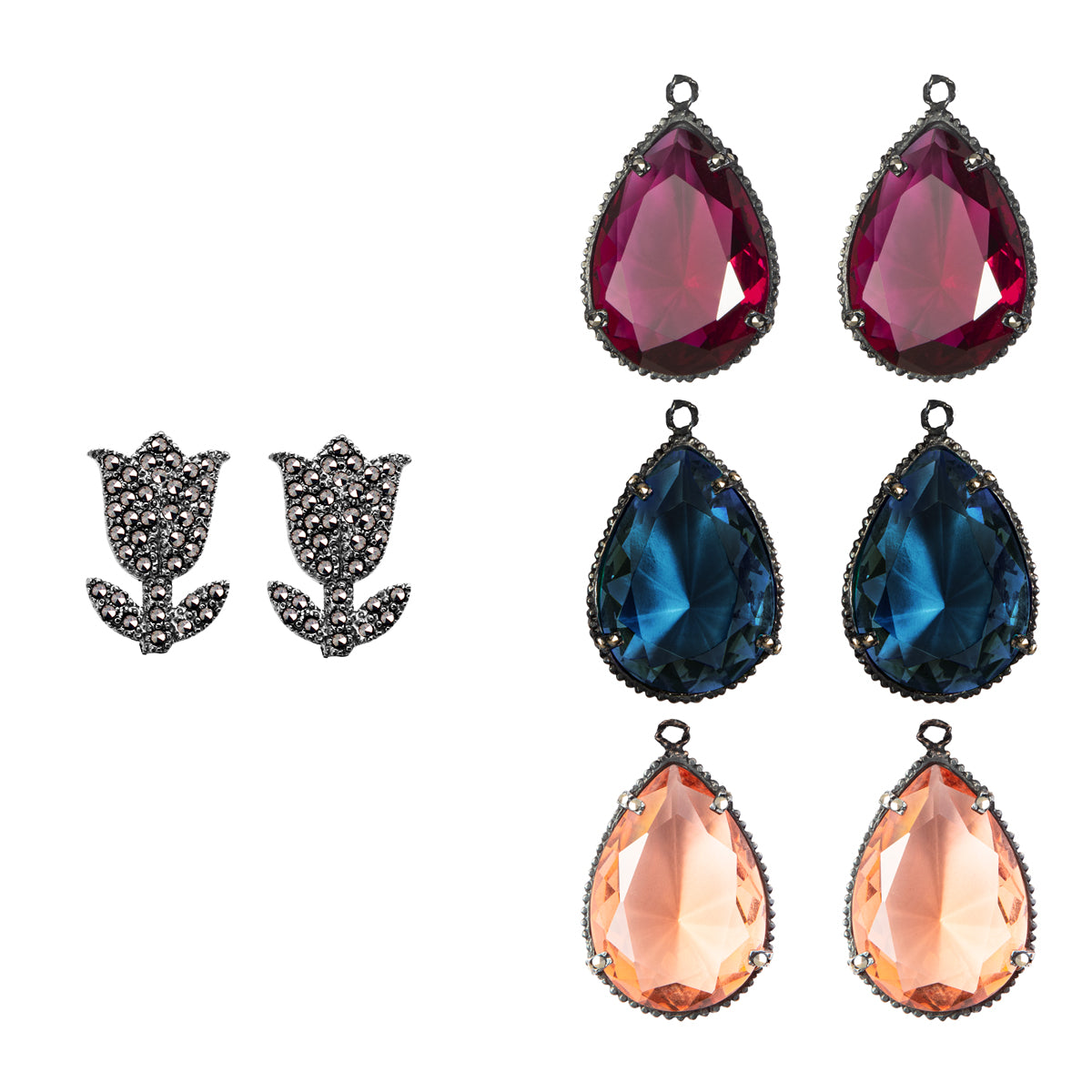 Arete tulipan pav plata .925 acabado pavonado e incrustación de piritas mas drop clasico pav color morganita, drop clasico pav color betamina y drop clasico pav color azul todos en plata .925 en pátina grisácea con incrustaciones de piritas y cristal facetado