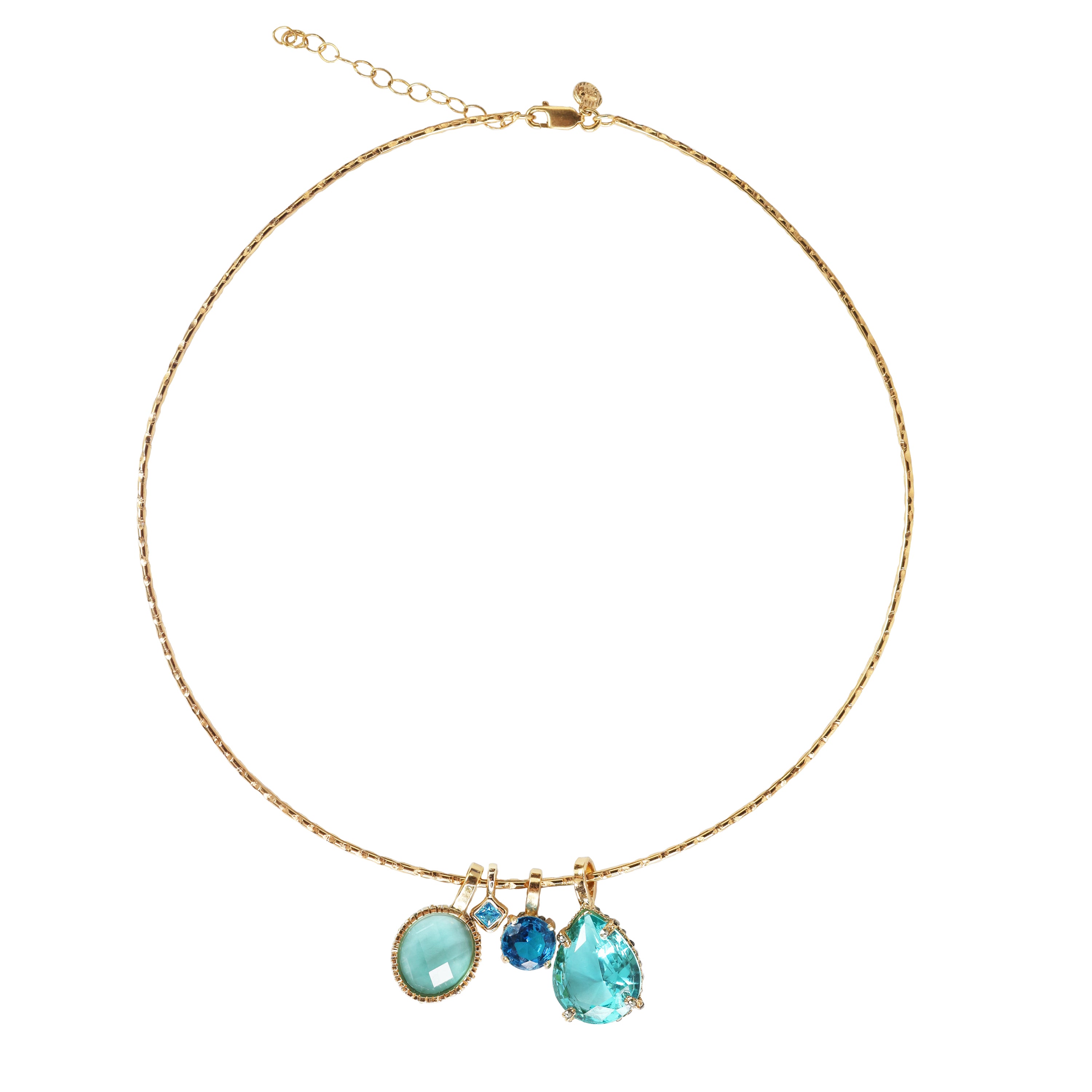 Collar Rígido con dijes en tonos azules: dije drop chico, dije Oval, de cristales facetados y plata .925 con baño de oro de 14k.